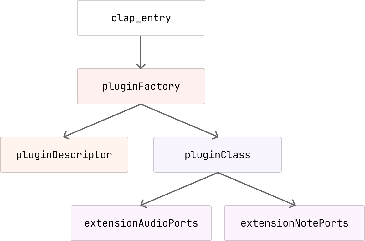 With that out of the way, we can turn our attention to the structure of a CLAP plugin. We need to export from our shared library a global variable clap_plugin_entry_t clap_entry. This will contain information about the version of the CLAP SDK we're using, and point to information about the shared library's plugin factory. The plugin factory, which we'll be describing in a variable clap_plugin_factory_t pluginFactory, is responsible for listing the plugins inside our shared library. We're only going to have one. The plugin factory will point to the descriptor of our plugin, clap_plugin_descriptor_t pluginDescriptor, and the main plugin class, clap_plugin_t pluginClass. The plugin descriptor contains the basic attributes of the plugin which the host can quickly grab while scanning. The plugin class contains pointers to the functions that actually implement the plugin. There are several of these, the most important being process, which is called by the host to let the plugin process input events and audio data; and the other important function is get_extension, which is where the plugin can advertise support of CLAP extensions.